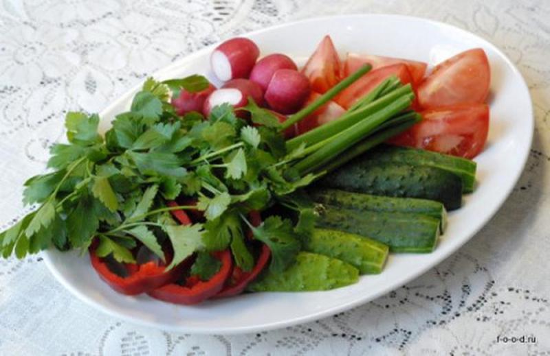 Состав: Помидоры, огурцы, редис, болгарский перец, зелень.