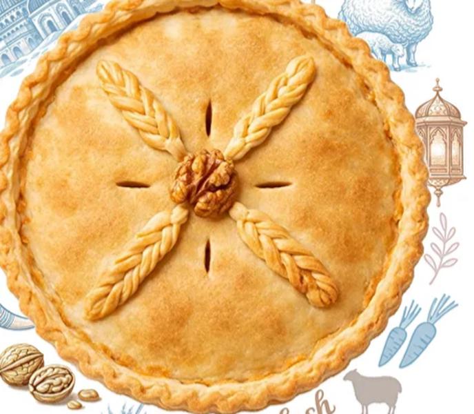 Состав: Начинка (баранина, курага, грецкий орех, петрушка, лук репчатый, вишневый сок), тесто (масло сливочное, мука пшеничная, яйцо куриное, сахар белый, соль, уксус, (сода пищевая)).