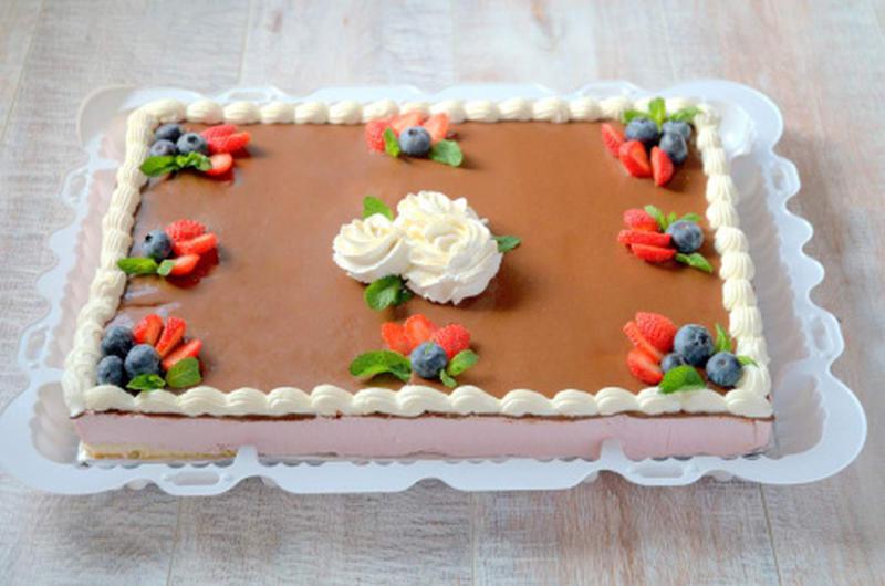 Состав: Бисквит, сливки, малиновое пюре, темный шоколад, яичный белок, сахарный песок, желатин. Цена указана за 1 кг.