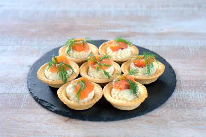 Состав: Тарталетки, семга свежесоленая, творожный сыр креметте, укроп. (7 шт).