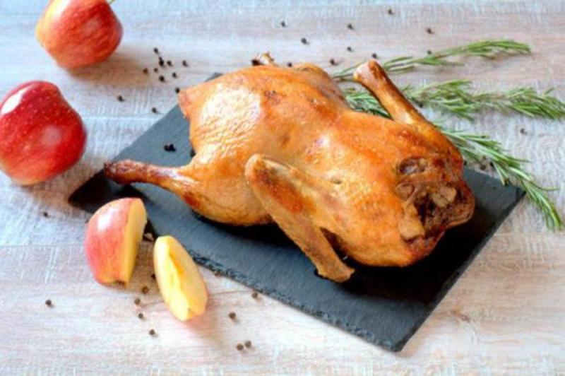 Состав: Утка тушка, яблоки, апельсины, вино белое сухое, лимонный сок, соевый соус, паприка, соль, молотый черный перец.