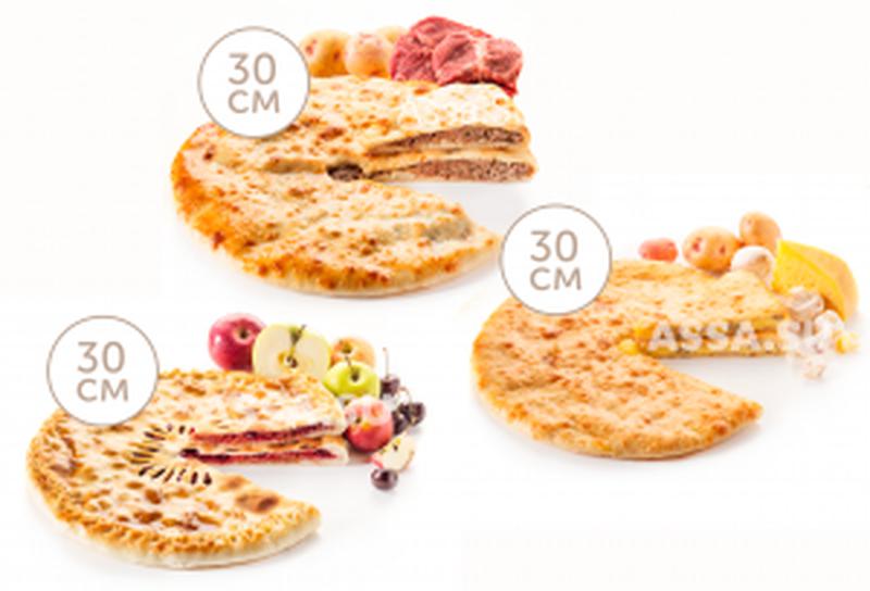 Состав: Фирменный пирог с мясом, картофелем и ароматными специями. Фирменный пирог с осетинским сыром, грибами и картофелем. Фирменный пирог со сладкими печеными яблочками